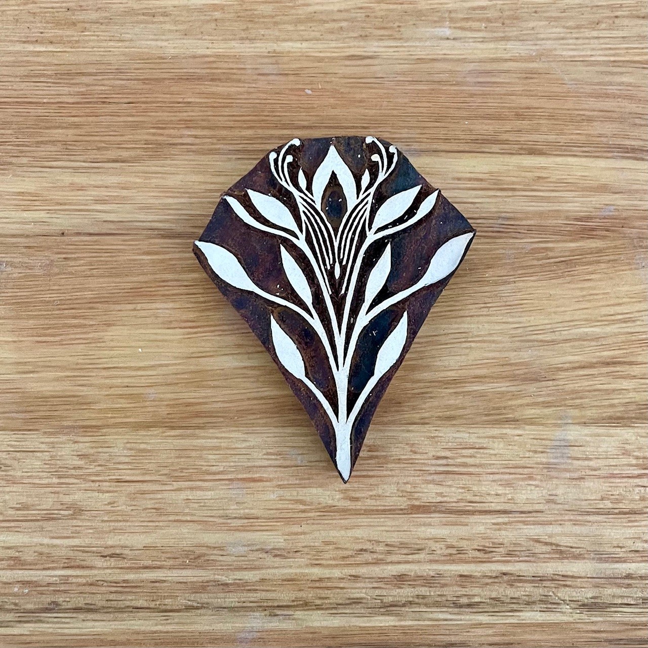 A beautifully carved rosewood stamp of an abstract plant, designed by a local Brisbane artist.